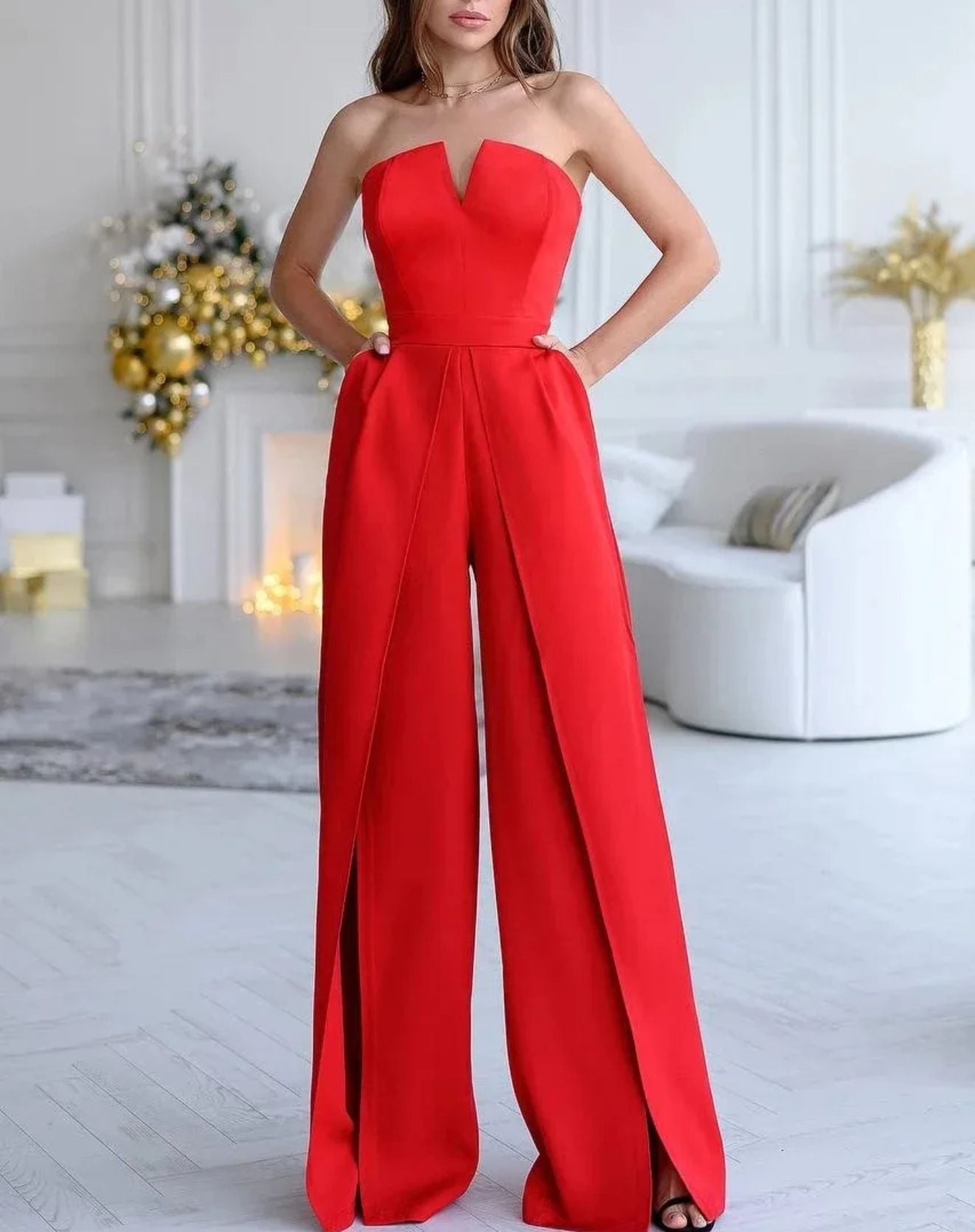 Uma peça chic e elegante para você arrasar em festas e eventos especiais. O MACACÃO MONICA TOMARA QUE CAIA é composto por um tecido macio e estruturado adaptando incrivelmente em seu corpo, possui mini decote em V, bolsos laterais, fenda frontal, zíper traseiro e calça pantalona. Você vai amar!